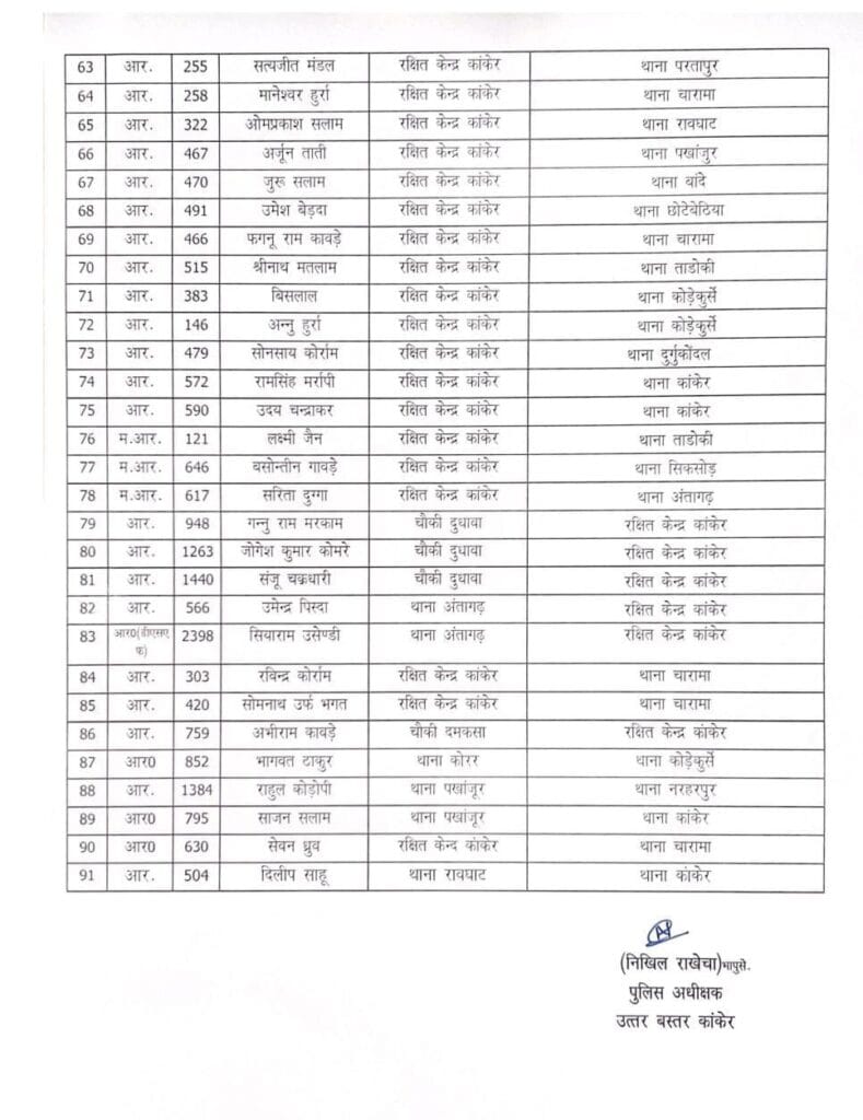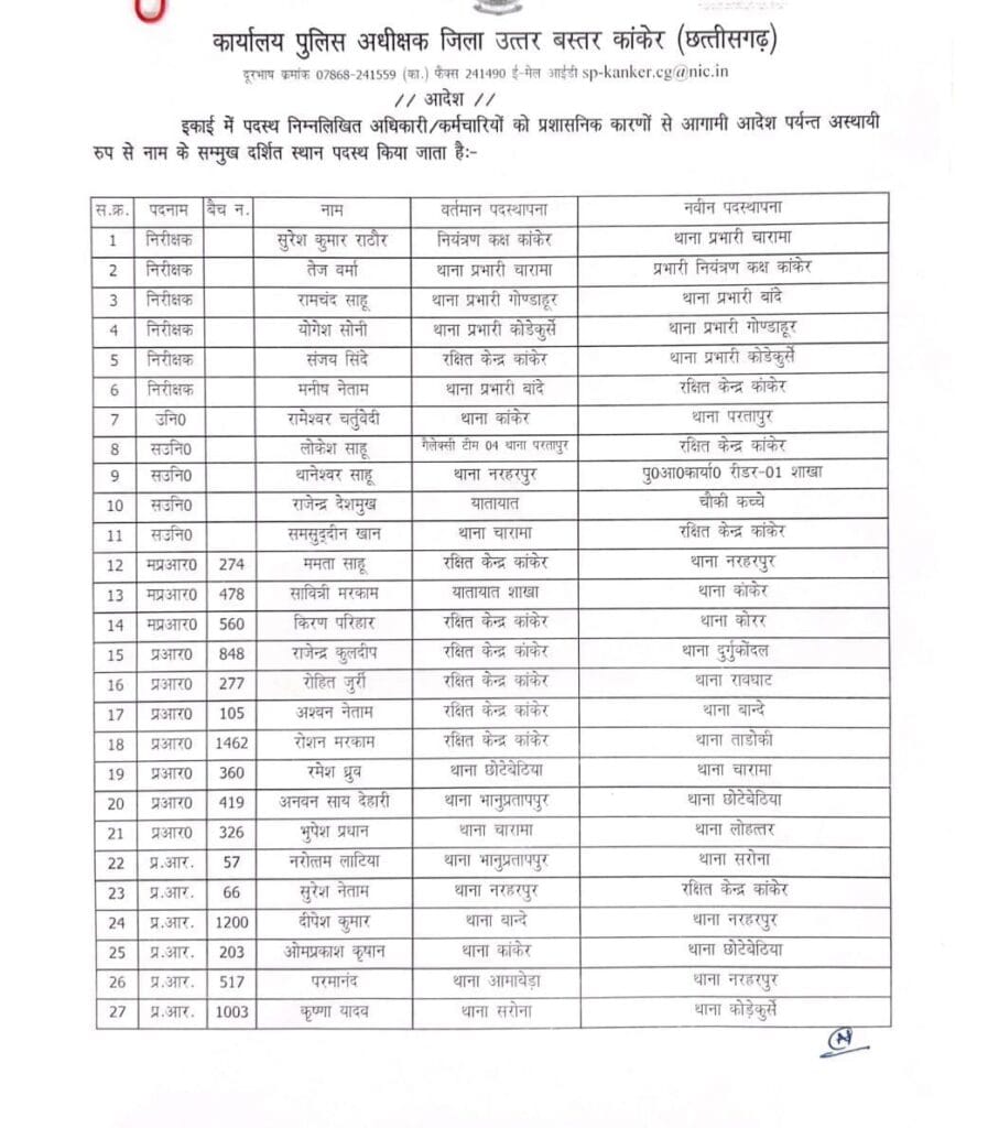 कांकेर। जिले में नए पुलिस कप्तान के कमान संभालने के बाद पुलिस महकमे में बड़ी सर्जरी देखने को मिली है, एसपी निखिल राखेचा ने 6 निरीक्षक समेत 91 पुलिसकर्मियों का तबादला आदेश जारी किया है, जिसमें चारामा , बांदे,गोंडाहुर, कोड़ेकुर्सी के थाना प्रभारियों को बदला गया है, चारामा में तेज वर्मा की जगह सुरेश राठौर को प्रभारी बनाया गया है, वही बांदे में मनीष नेताम को हटाकर उनकी जगह रामचंद्र साहू को प्रभारी बनाया गया है। देखिए सूची